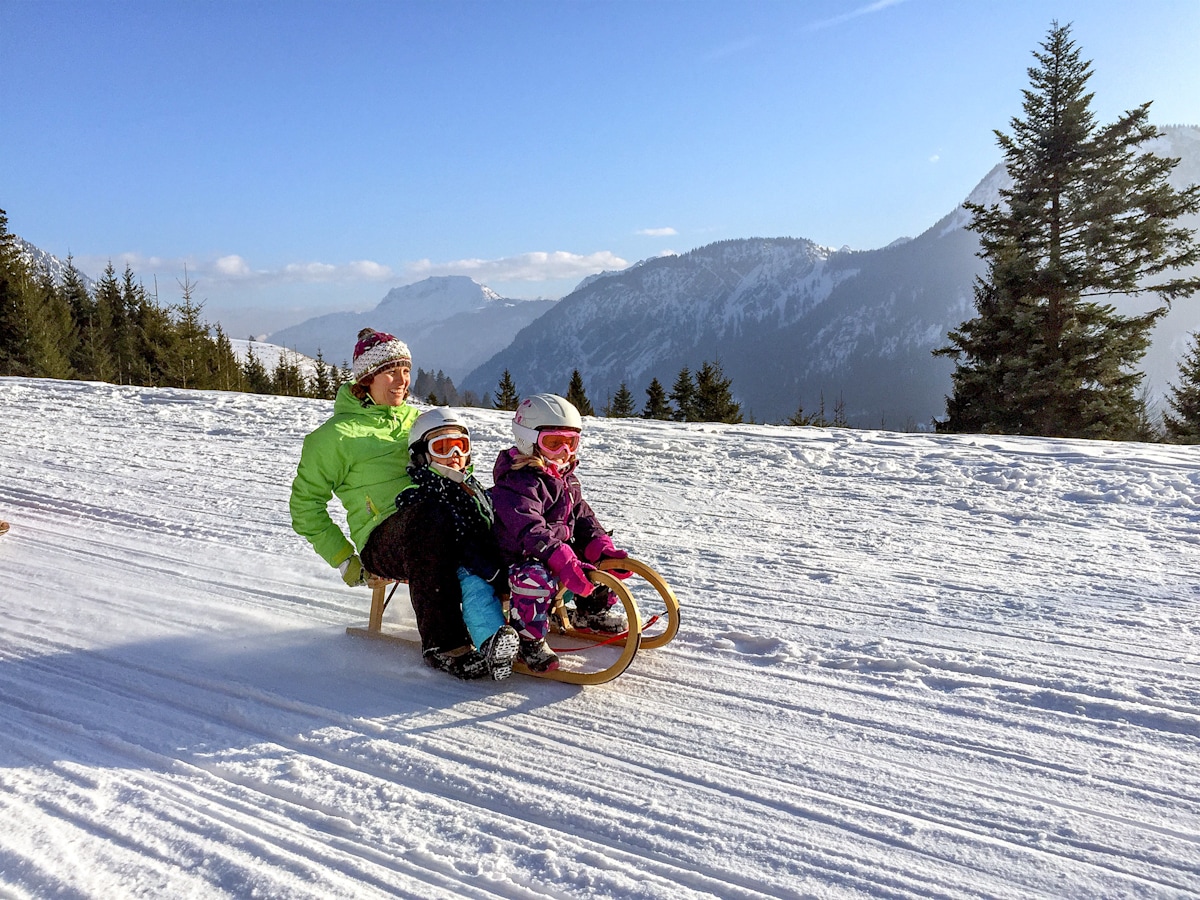 Oft reicht der Schnee für eine Skitour noch nicht wirklich – da ist Rodeln eine super Alternative. Als meine Kinder noch klein waren, bin ich mit ihnen die guten, alten Hornschlitten gefahren. Seinen Namen hat der Hornschlitten von den vorn nach oben verlängerten Kufen, die zum Lenken des Schlittens und als Haltegriffe dienen.